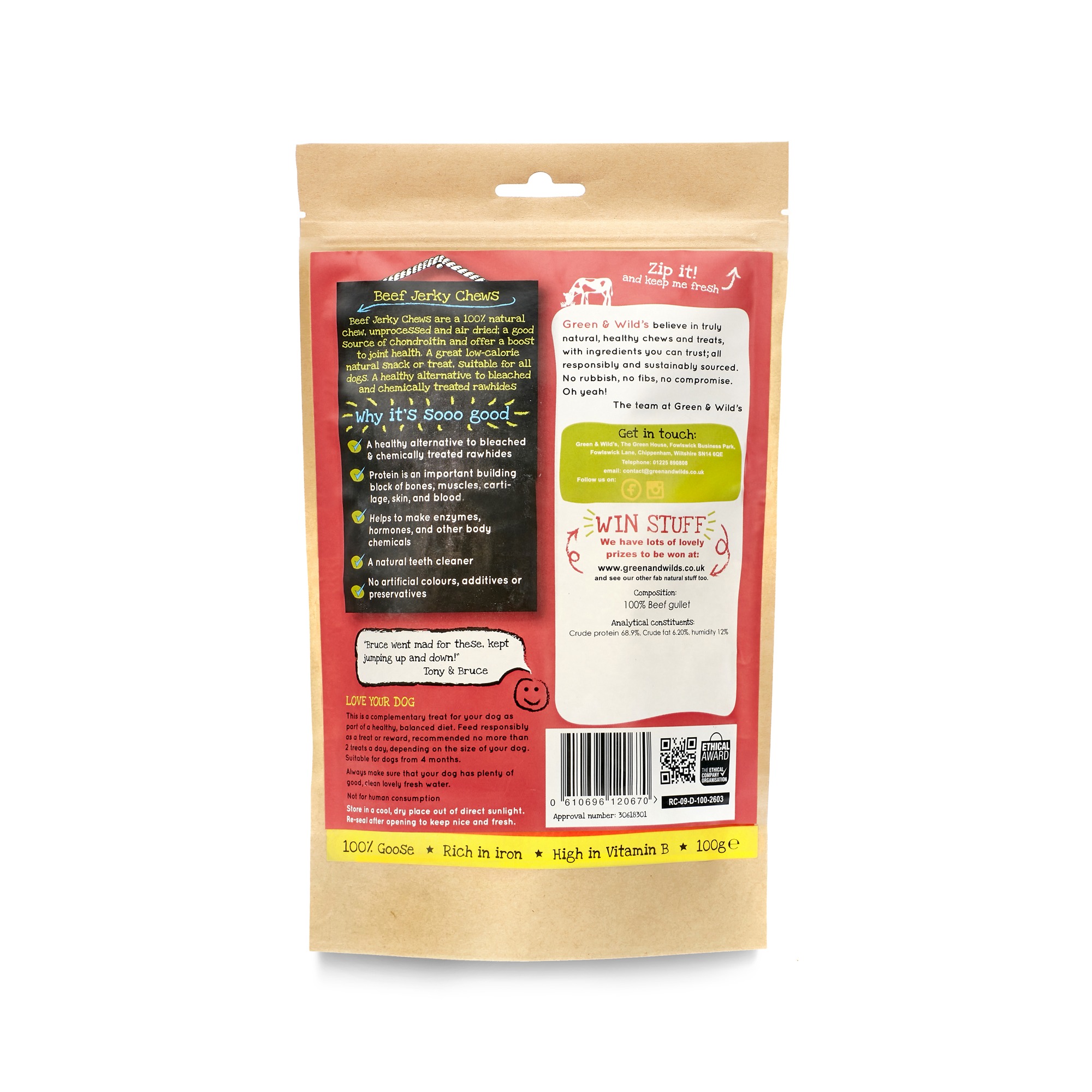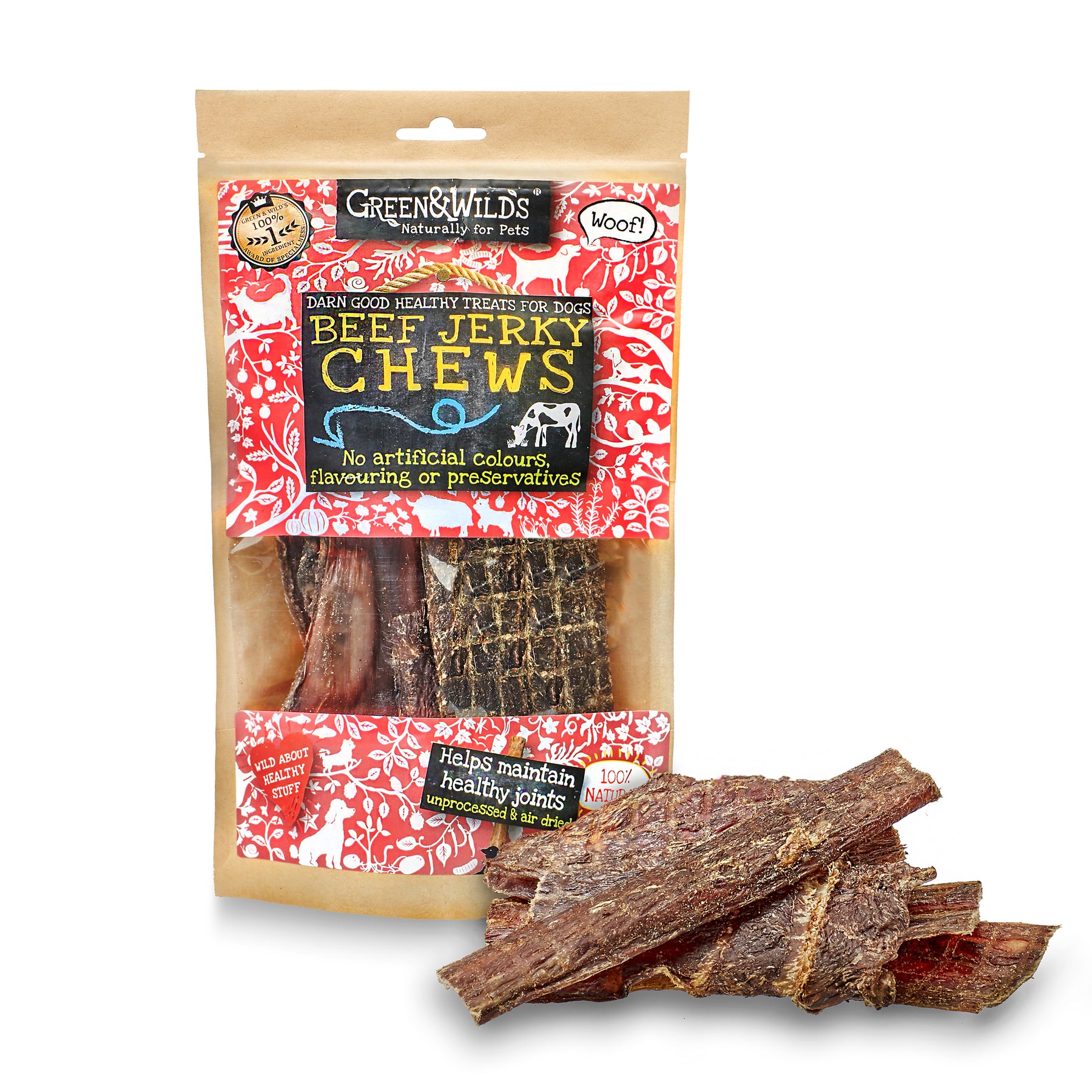 House of Paws is proud to stock Green and Wilds Beef Jerky Chews. Made from 100% British beef, these chews are perfect for dogs who love a good chew.